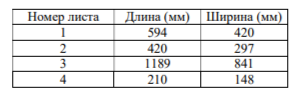 В таблице даны размеры (с точностью до мм) четырёх листов, имеющих форматы А0, А2, А3 и А5.
