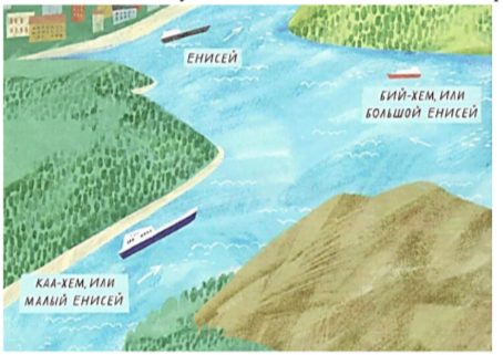 Любая река начинается с ручейка, озера или горного ледника. Место её рождения называется исто́к. А у́стье – это место её впадения в море или другую реку. У Енисея два истока, поэтому говорят, что у него две головы. Первый исток зовётся Бий-Хем – «большая река». Он вытекает из горного озера в Саянах. Второй исток, Каа-Хем – «малая река», начинается на границе России и Монголии. Оба истока сливаются у города Кызы́ла, столицы Тувы́ . Здесь и образуется Енисей, которому предстоит путь почти в 3500 километров. Пробежав примерно сто километров, Енисей временно успокаивается и распадается на множество ответвлений – рукавов. Это место прозвали Сорок Енисеев. Потом все рукава соединяются в один поток, который поворачивает на север. А заканчивается река Енисейским заливом Ка́рского моря. Енисей здесь такой широкий, что берегов не видно и трудно понять, где огромная река вливается в воды моря. Только зачерпнув ведром воды из- за борта, замечаешь, что она становится солёной. Провести судно по могучему Енисею может не всякий капитан. На пути встретятся и опасные быки – береговые скалы, о которые корабль может разбиться, и коварные поро́ги. Один из самых грозных порогов – Каза́чинский. В старину мало кто рисковал проходить на корабле этот узкий участок с быстрым течением и огромными камнями на дне. Приходилось перетаскивать грузы, а иногда и сами корабли по берегу. Победу над подводными скалами одержали в 1903 году, когда на Енисее заработало судно-проводник – ту́ер. Туер движется по стальному канату, уложенному по дну реки, поэтому чётко проходит между всеми опасными скалами и тянет за собой другие суда. Это единственный туер в России. Тувинцы назвали Енисей Улуг-Хем, что означает «великая река», эвенки – Ионе́сси, «большая вода», а русские величают – Енисей-батюшка. В Енисей впадает больше 500 рек и речушек. И по полноводности в России ему нет равных. Енисей несёт в море в два раза больше воды, чем Волга. Великая река, богатырская!