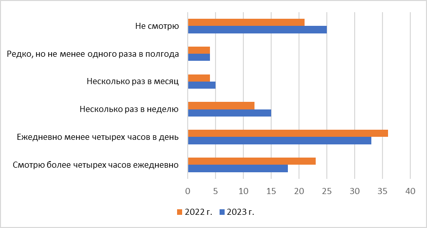 Задание 12. В ходе социологического опроса совершеннолетних россиян им задавали вопрос: «Смотрите ли Вы телевизионные программы, неважно, по телевизору или через интернет на любом устройстве? Если смотрите, то как часто?» (можно было дать один ответ). Результаты исследования (в % от числа опрошенных) представлены в виде диаграммы.