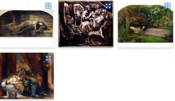 Перед вами четыре картины, изображающие героини из трагедий Шекспира и обстоятельства их смерти. Выберите картину, на которой изображена Офелия.