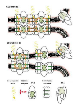 Задание 12. Фотосинтетический аппарат растений способен очень гибко адаптироваться к условиям среды. Например, мобильная антенна (часть светособирающего комплекса фотосистемы 2, ФС2) может при необходимости отстыковываться от своей фотосистемы, перемещаться по мембранам тилакоидов и ламелл и присоединяться к фотосистеме 1 (ФС1) (см. рис). При изменении внешних условий возможен и обратный переход мобильной антенны к ФС2. Принято считать, что фотосинтетический аппарат находится в состоянии I, когда мобильная антенна связана с ФС2, и в состоянии II, когда мобильная антенна связана с ФС1. Внимательно рассмотрите рисунок и выберите верное утверждение: