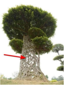 а) утолщающимися стеблями растения-лианы, обхватившими ствол дерева-хозяина;