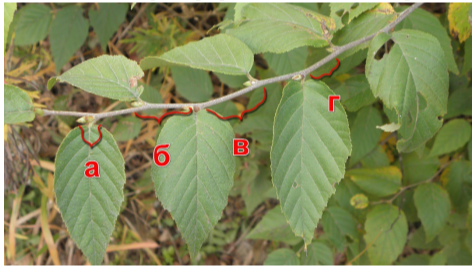 Задание 8. Наземная сфера растений образована побегами, каждый из которых состоит из повторяющихся частей — метамеров. В свою очередь, метамер включает в себя узел, прикрепляющиеся в области узла лист и пазушная почка, и нижерасположенное междоузлие. Какой буквой на фотографии обозначен метамер у этого растения?