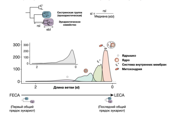 Задание 30. Рассчитывали относительный возраст различных генных семейств у эукариот. Для этого для каждого генного семейства находили сестринское семейство среди прокариот (архей или бактерий), а затем рассчитывали длину ветви (sl), которая отражает нормированное расстояние между эукариотическим и прокариотическим семейством. Исследовали гены, которые функционально связаны с одним из компартментов клетки: ядрышком, ядром, системой внутренних мембран и митохондриями. На основании представленных данных можно утверждать, что позднее всего эукариоты приобрели: