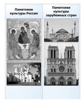 Задание 8. На каких двух изображениях представлены памятники культуры России, а на каких двух — памятники культуры зарубежных стран? Перетащите изображения в соответствующие столбцы таблицы.
