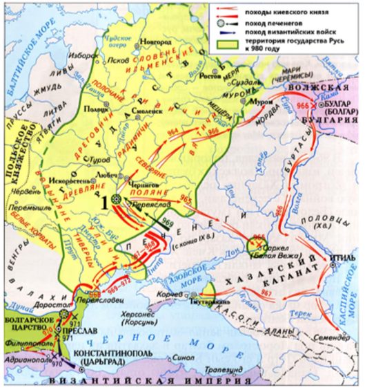 Б. Какое государство прекратило существование во время правления князя, походы которого обозначены на карте-схеме?