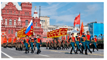 Знаменосцы, возглавляющие парад, проносят Знамя Победы над фашистской Германией.