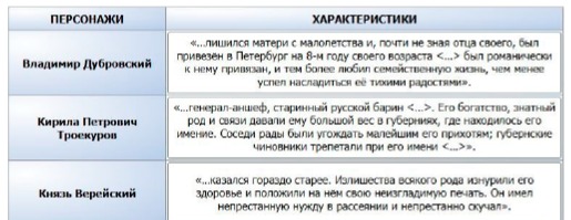 Задание 10. Установите соответствие между персонажами романа А.С. Пушкина «Дубровский» и их характеристиками.