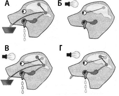 12. На рисунках под буквами А–Г изображены стадии образования условного рефлекса у собаки. На каком из рисунков демонстрируется безусловный слюноотделительный рефлекс?