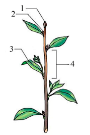 4. На рисунке изображена схема строения побега. Какой цифрой на нём обозначена боковая (пазушная) почка?