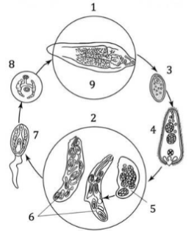 Задание 9. Под каким номером на схеме жизненного цикла паразита обозначена циста?