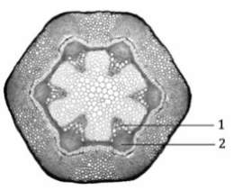 Задание 24. Назовите структуры стебля, обозначенные на рисунке цифрами 1 и 2. Какие функции они выполняют. К какому классу относится растение, поперечный срез которого изображён на рисунке. Ответ поясните.