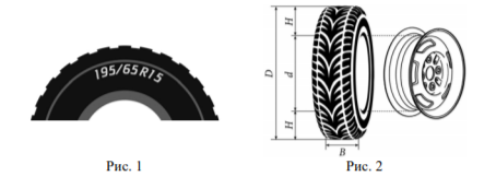 Для маркировки автомобильных шин применяется единая система обозначений. Например, 195/65 R15 (рис. 1). Первое число означает ширину шины в миллиметрах (размер B на рис. 2). Второе число — высота боковины шины H в процентах от ширины шины. Например, шина с маркировкой 195/65 R15 имеет ширину B =195 мм и высоту боковины H =195⋅0,65 =126,75 (мм).