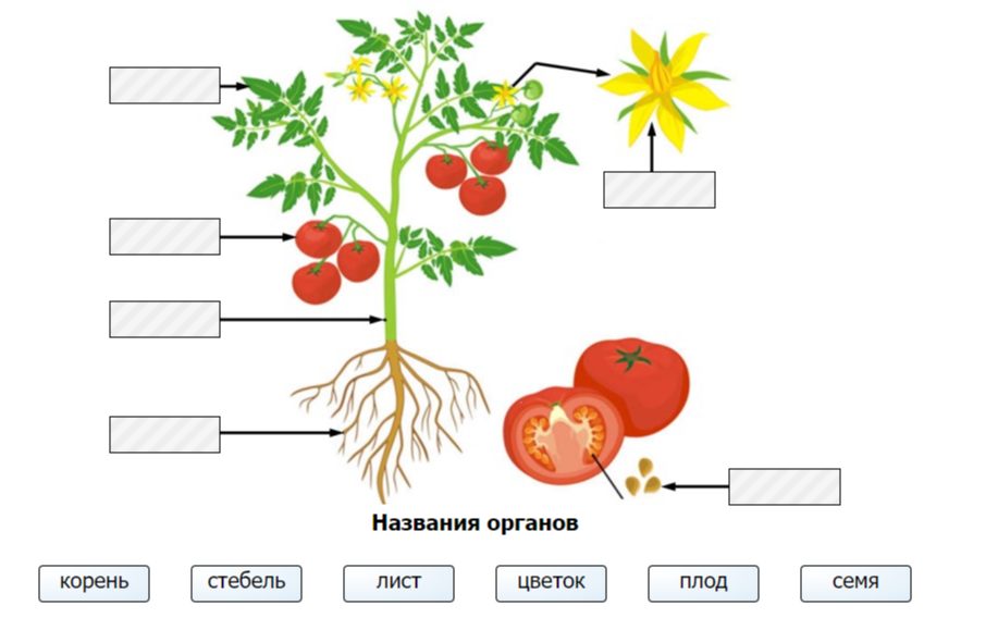 Задание 7. Установите соответствие между органами растения томат, изображённого на рисунке, и их названиями, перетаскивая названия органов к соответствующим стрелкам.