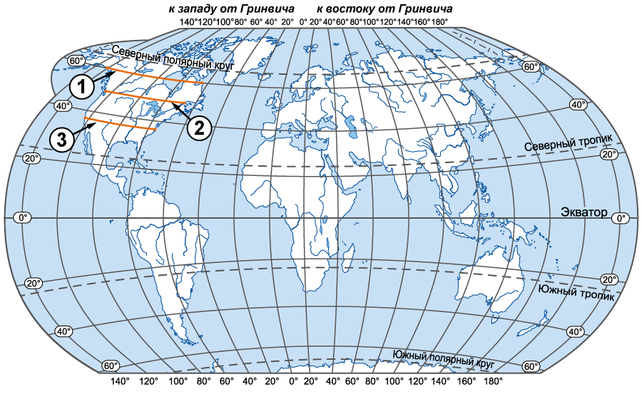 По какой из линий, проведённых на карте вдоль трёх параллелей, пересекающих материк Северная Америка, построен профиль рельефа, представленный на рисунке? Укажите в ответе номер этой линии.