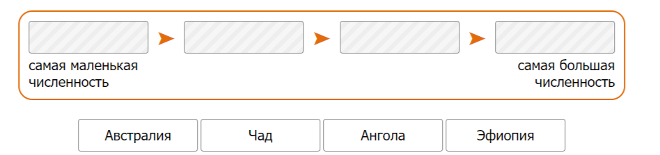 Расположите страны в порядке увеличения численности населения, начиная со страны с самой маленькой численностью.