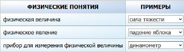 Задание 1. Установите соответствие между физическими понятиями и примерами этих понятий: для каждой позиции из первого столбца подберите соответствующую позицию из выпадающего списка.