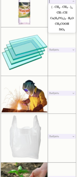 Задание 9. Установите соответствие между предметами и формулами веществ, являющихся их основными компонентами.