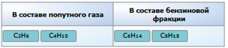 Ниже приведены формулы некоторых углеводородов, полученных при перегонке нефти. Укажите, какие из них входили в состав попутного газа, а какие — в состав бензиновой фракции. С помощью компьютерной мыши перетащите формулы в соответствующие столбцы таблицы.