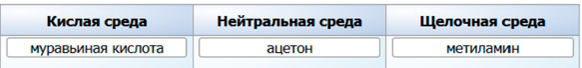 Задание 12. В трёх колбах находятся три водных раствора: ацетона, муравьиной кислоты и метиламина. Определите характер среды каждого из растворов. Заполните таблицу: переместите названия приведённых веществ, используя компьютерную мышь
