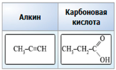 Задание 13. Из приведённого перечня выберите алкин и карбоновую кислоту. Переместите с помощью компьютерной мыши выбранные формулы в соответствующие ячейки.