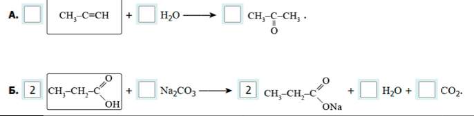 Задание 14. В предложенные схемы химических реакций переместите с помощью компьютерной мыши структурные формулы пропущенных веществ, выбрав их из приведённого выше перечня. Расставьте коэффициенты в пропущенных схемах, чтобы получились уравнения реакций. Для записи коэффициентов воспользуйтесь клавиатурой.