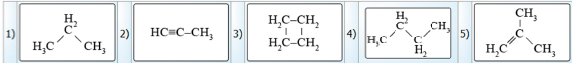 Выберите из приведённых структурных формул веществ непредельный углеводород с наибольшей молярной массой. Перетащите с помощью компьютерной мыши выбранную формулу в пустую ячейку. Выберите формулу продукта взаимодействия этого вещества с водой. Не предельный углеводород