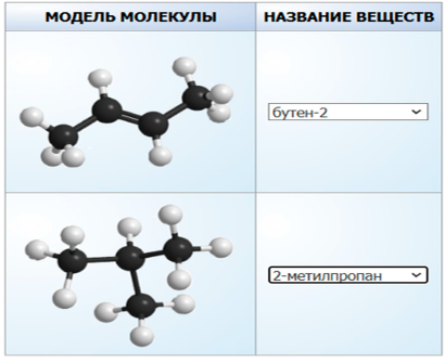 шаростержневые модели молекул двух веществ. Установите соответствие между моделями молекул и названиями веществ, которые соответствуют этим моделям: к каждой позиции из первого столбца подберите позицию из выпадающего списка.