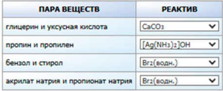 Задание 12. Установите соответствие между двумя веществами и реактивом, с помощью которого можно различить эти вещества. Для каждой позиции из первого столбца подберите соответствующую позицию из выпадающего списка.
