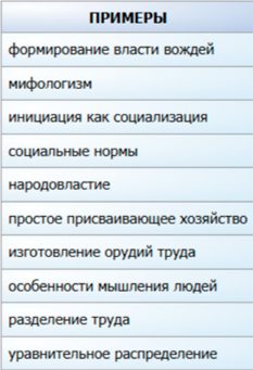 (6)Мужчина стал преимущественно охотником; женщина сосредоточилась на собирательстве, домашнем хозяйстве; дети и старики помогали трудоспособным членам общины. (16)Существовали социальные нормы, т.е. обязательные, общественно-охраняемые правила поведения — разделение труда, сотрудничество, распределение и др. (17)Применяясь из поколения в поколение, они становились обычаями.