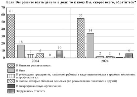Задание 9. ВЦИОМ проводил в 2004 и 2024 гг. опросы населения с целью выяснить, как часто люди берут деньги в долг и у кого их занимают. Полученные результаты (в % от числа опрошенных) представлены в виде диаграммы.