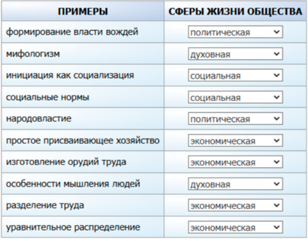 Задание 7.2. А. Установите соответствие между примерами и сферами общественной жизни: для каждой позиции из первого столбца подберите позицию из выпадающего списка.