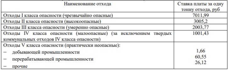 Таблица 1 – Ставки платы при размещении одной тонны отходов разных классов опасности