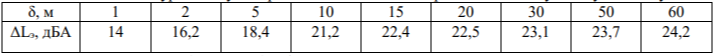 Снижение уровня звука от его рассеивания в пространстве, дБА, ΔLрас = 10 · lg(rn / r0),