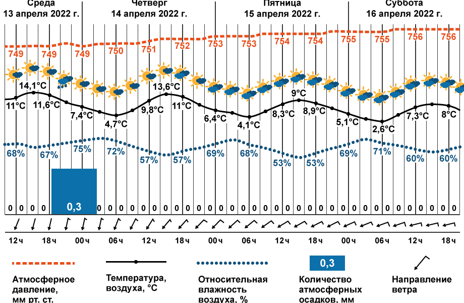Определите суточную амплитуду температуры воздуха в четверг, 14 апреля 2022 г.