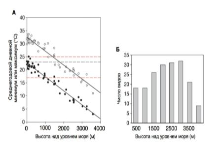 2. На графике А показана зависимость среднегодовых дневных минимальных (черные круги) и максимальных (белые круги) температур от высоты над уровнем моря. Красные пунктирные линии выделяют диапазон от 17 до 25 C. В диапазоне высот от 1000 до 2500 м температура воздуха часто совпадает с оптимальным диапазоном для развития патогенного грибка (Batrachochytrium dendrobatidis). Проанализируете диаграмму Б, где показано число видов амфибий на разных высотах, и ответьте на вопрос.