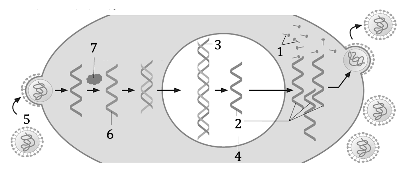 Задание 5. Какой цифрой на рисунке жизненного цикла ретровируса обозначен фермент обратной транскрипции?