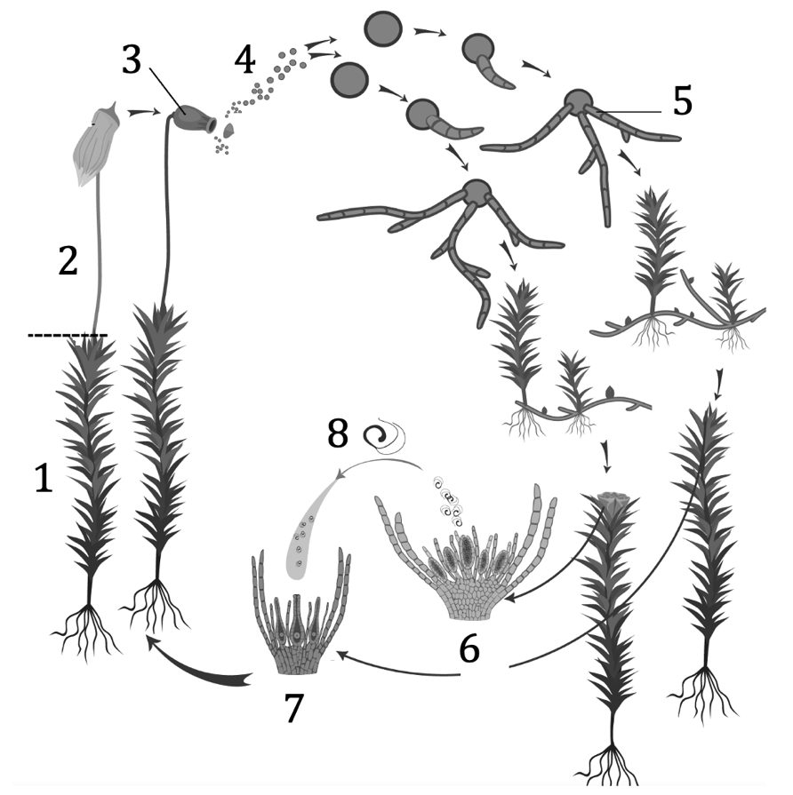 Задание 10. Установите соответствие между характеристиками и стадиями жизненного цикла мха, обозначенными на рисунке цифрами 1 и 2: к каждой позиции, данной в первом столбце, подберите соответствующую позицию из второго столбца.