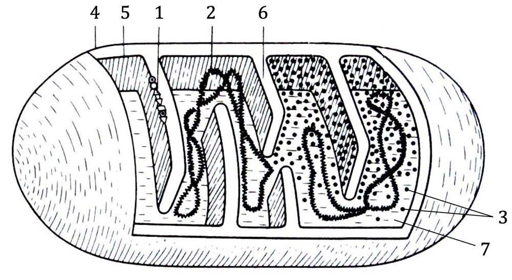 Задание 5. Какой цифрой на рисунке митохондрии обозначена среда для протекания реакций цикла Кребса?