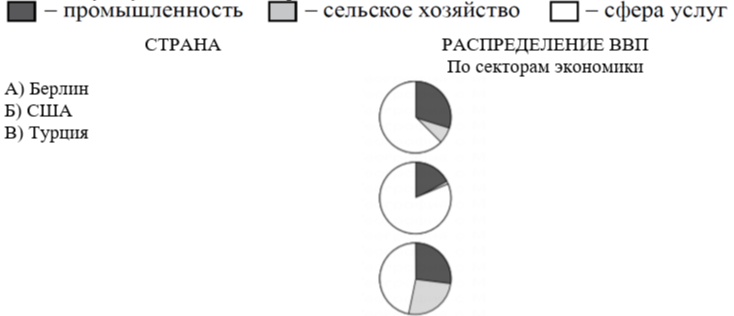 Задание 7. Установите соответствие между страной и диаграммой, отражающей распределение её ВВП по секторам экономики: к каждой позиции, данной в первом столбце, подберите соответствующую позицию из второго столбца.