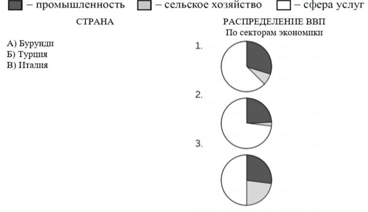 Задание 7. Установите соответствие между страной и диаграммой, отражающей распределение её ВВП по секторам экономики: к каждой позиции, данной в первом столбце, подберите соответствующую позицию из второго столбца.
