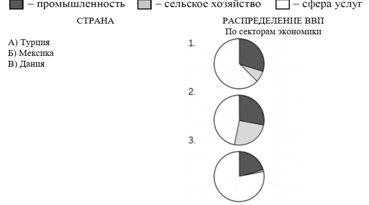 Задание 7. Установите соответствие между страной и диаграммой, отражающей распределение её ВВП по секторам экономики: к каждой позиции, данной в первом столбце, подберите соответствующую позицию из второго столбца