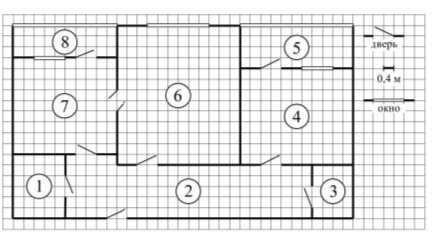 В жилом комплексе «Озёрки» новосёлам предоставляются квартиры улучшенной планировки. На рисунке изображён план такой двухкомнатной квартиры. Сторона одной клетки на плане соответствует 0,4 м, а условные обозначения двери и окна приведены в правой части рисунка. Входная дверь в квартиру находится в коридоре. Слева от входа в квартиру располагается санузел, а в противоположном конце коридора — дверь в кладовую. Рядом с кладовой — спальня, из которой можно пройти на одну из застеклённых лоджий. Самое большое по площади помещение — гостиная, откуда можно попасть в коридор и на кухню. Из кухни также можно попасть на застеклённую лоджию.