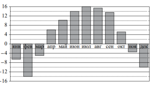 Задание 3. На диаграмме показана среднемесячная температура воздуха в Нижнем Новгороде за каждый месяц 1994 года. По горизонтали указываются месяцы, по вертикали — температура в градусах Цельсия.
