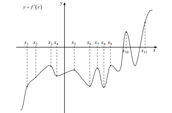 Задание 8. На рисунке изображён график функции y = f ‘( x) — производной функции f ( x). На оси абсцисс отмечено одиннадцать точек: x1, x2, x3, x4, x5, x6, x7, x8, x9, x10, x11. Сколько из этих точек принадлежит промежуткам возрастания функции f (x)?