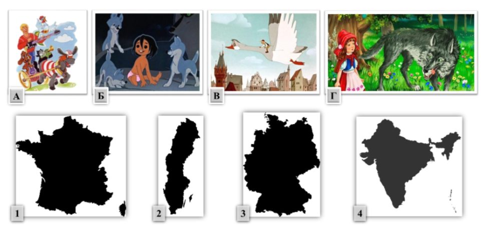 Задание 3. Установите соответствие между иллюстрациями сказочных персонажей и контурами стран мира, в которых жили эти сказочные герои.