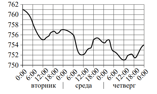 Задание 3. На рисунке показано изменение атмосферного давления в течение трёх суток. По горизонтали указаны дни недели и время, по вертикали — значения атмосферного давления в миллиметрах ртутного столба. Определите по рисунку значение атмосферного давления в среду в 18:00. Ответ дайте в миллиметрах ртутного столба.