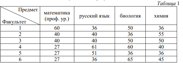 Задание 6. В таблице 1 приведены минимальные баллы ЕГЭ по четырём предметам, необходимые для подачи документов на факультеты 1–6.