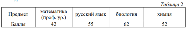 В таблице 2 приведены данные о баллах ЕГЭ по четырём предметам абитуриента В