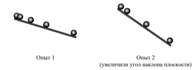Задание 16. Учитель на уроке провёл два опыта по изучению движения тела по наклонной плоскости: шарик скатывался по наклонной плоскости из состояния покоя, причём фиксировались начальное положение шарика и его положения через каждую секунду после начала движения (см. рисунок).